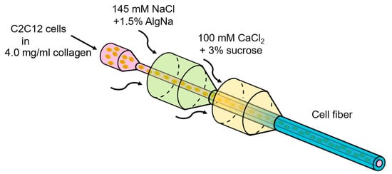 To mimic the “native” muscle structure, we focused on cell fiber technology [21]. This technology encapsulates living cells into the core region of a hydrogel core-shell microfiber, allowing the cells to grow, migrate, promote cell-cell interaction, and form a fiber-shaped tissue called “cell fiber”. Using this cell fiber technology based on the hydrogel tube structure, gases (O2 and CO2) and nutrients are allowed to penetrate into the core region containing cells [22], leading to an efficient cell expansion with high viability.