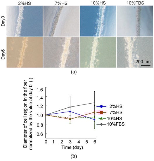 Cell-laden core-shell hydrogel microfiber culture under 2%, 7%, and 10% horse serum (HS) and 10% fetal bovine serum (FBS) conditions. (a) Phase-contrast images and (b) the change in the diameter of cell-laden core along with culture time. Scale bar: 200 μm.