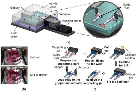 Custom-made cell culture device for “cell fiber” to impose the cyclic stretch. (a) Schematic of the culture device, (b) photograph of the gripper for hydrogel fibers, and (c) procedure to grab the fibers using the collagen gel and two stainless rods.