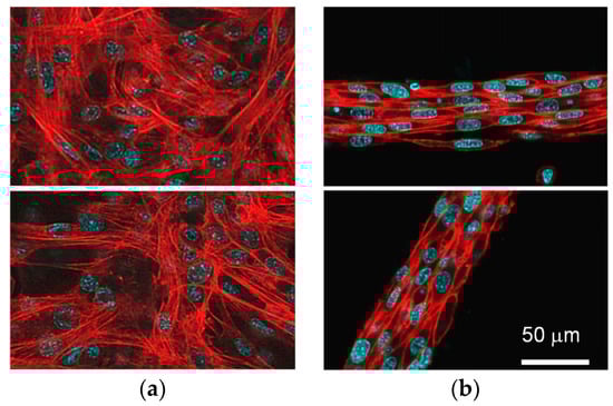 To evaluate the effect of the three-dimensional culture condition on myogenesis of C2C12 cells, the cytoskeletons of both the monolayer culture and the cell fiber were evaluated (Figure 4). The direction of the cytoskeleton in the monolayer culture was random, whereas the cytoskeleton in the cell fibers aligned to the cylindrical axis of the fiber. It was suggested that the C2C12 cells reorganized their structure of cytoskeleton to align the wall of the gel fiber. Many studies reported that the direction of the cells aligned to the groove of the culture substrate to reorganize the cytoskeleton of the cell [27,28,29,30]. The result of our study was consistent with these studies.