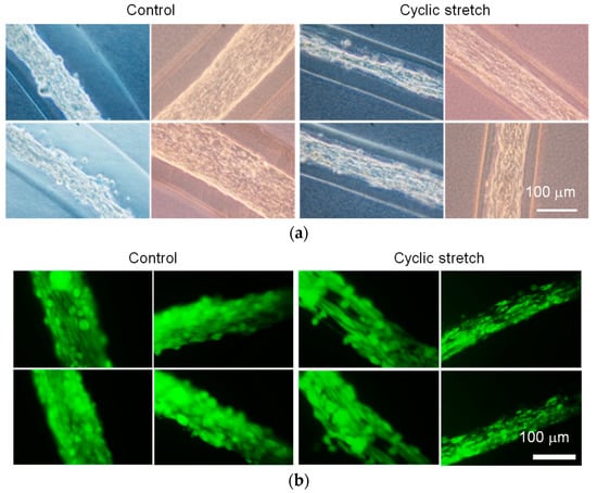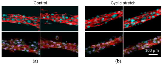 In order to reconstruct the skeletal muscle tissue for the tissue engineering therapy, it is important to culture the cells three-dimensionally with physical stimuli. For in vitro skeletal muscle regeneration, various physical factors are reported to align the cells and progress tissue maturation [15,16,27,28,29,30,31]. Among them, mechanical stress-like tension or electrical stimuli have been reported to affect the cell alignment and maturation in vitro [15,16]. For myoblasts or myoblast-like cells, the stretch could enhance the myosin expression to promote myogenesis [26]. Consistent with these studies, it was considered that the cyclic stretch promoted the myogenesis of the C2C12 cells and the maturation of the muscle fibers in cell-laden hydrogel fibers. Especially, cells in the skeletal muscles, also in addition to the cardiac muscles, are constantly subjected to cyclic mechanical stretch to generate highly differentiated and maturated muscle fibers. Therefore, mechanical stimuli could be an important factor for tissue regeneration of the skeletal and the cardiac muscles.