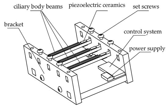 The structure of the piezoelectric tactile feedback device is shown in Figure 1, mainly including set screws, piezoelectric ceramics, ciliary body touch beams, bracket, control system, and power supply, of which the control system includes an analog-to-digital conversion module, power amplifier modules, and Bluetooth modules.