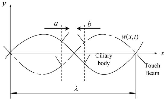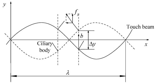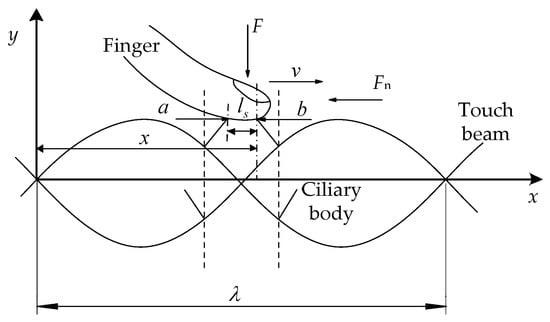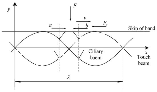 Since the ciliary body touch beam accomplishes different surface roughness by the anisotropic vibration of ciliary bodies, the number of the ciliary bodies in the two vibrating directions is the main factor in controlling the overall equivalent friction coefficient under the skin-covering length. As shown in Figure 4, the ciliary bodies’ anisotropic vibration dynamic model has a vibration of a wavelength, λ. When the ciliary touch beam vibrates between the solid line and the dashed line, the ciliary bodies will squeeze the skin from the bottom to the top. In the process of squeezing the finger skin upwards, the ciliary bodies, a, will move from left to right in the horizontal direction, and the ciliary bodies, b, will move from right to left in the horizontal direction.