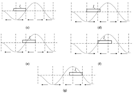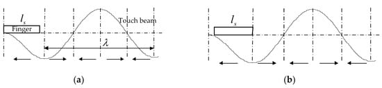 One cantilever touch beam was selected as the research object, and the relevant parameters were the same as in Table 1, Table 2 and Table 3. One operating mode of the touch beam is shown in Figure 10, and the covered length of the finger was considered as ls = 0.01 m. In the course of the uniform movement of the finger on the touch beam, according to the theory of the ciliary body’s anisotropic vibration, the ratio of the ciliary bodies of the first whole wave segment, a/u, exists in six stages. Then, seven key positions of the finger exist on the touch beam. The change rules were as follows: