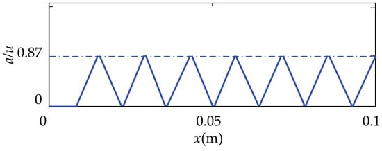 From Equation (15), the relationship between the proportion of the same directional ciliary bodies and the positional coordinates is shown in Figure 11. From the image, we know that the ratio, a/u, increases from zero and then decreases when the finger moves from left to right, and periodically alternates in the interval of [0,0.87]. The value of a/u maintains a shorter distance when it is at a maximum or minimum position.
