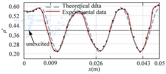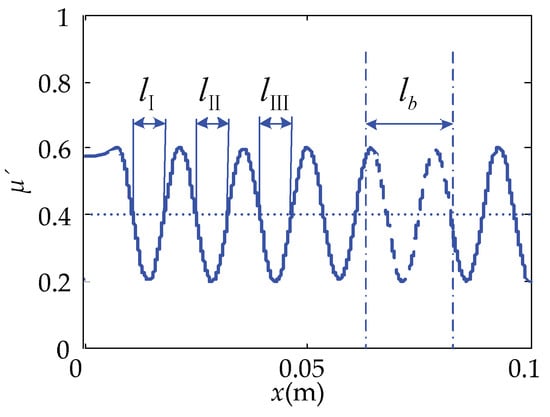 The equivalent friction coefficient of the touch beam also alternates periodically and fluctuates around 0.2 to 0.6 and centered at μ’ = 0.4. There are four troughs of the equivalent friction coefficient on the left side of the length, lb, of the piezoelectric sheet, which is the place where the equivalent friction coefficient is relatively low and is also a relatively smooth position. However, the distance between the fourth valley (from left to right) and the segment where the piezoelectric sheet is located is short, and it is difficult to move in the length of this segment during the actual touch process. Therefore, the first three valleys, lI, lII, and lIII, are the three easily perceived smoother positions on the left side of the piezoelectric sheet. Taking the position of the trough at each position as the base point, they are respectively located at 0.0137, 0.0275, and 0.0422 m on the abscissa, x.