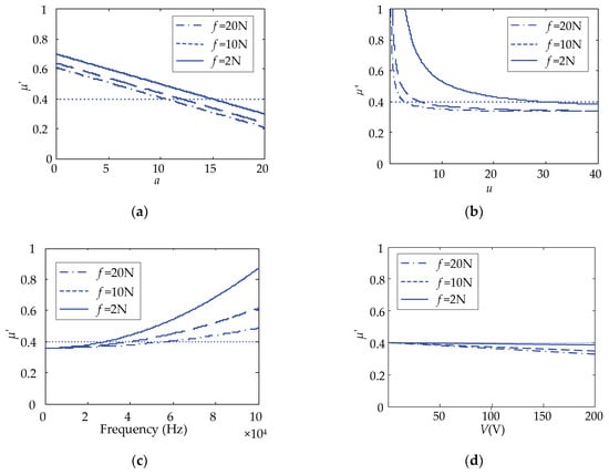 - Under the full-coverage touch, the change of the parameter, a, and frequency has the greatest influence on the equivalent friction coefficient. Although u has a great influence on the friction coefficient at the beginning, with the increase of u, the effect after 20 is not significantly changed. In order to achieve the best results, the same directional ciliary bodies, a, and voltage, V, should be increased as much as possible, and the parameter u can be kept within 20.
