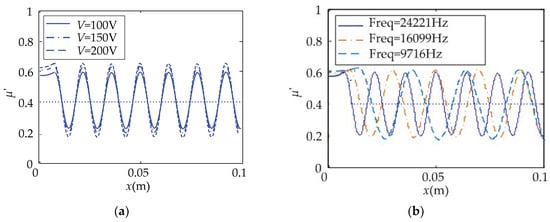 The changes of μ’-x under the effect of operating parameters in local-coverage. (a) Operating voltage changed; (b) operating frequency changed.