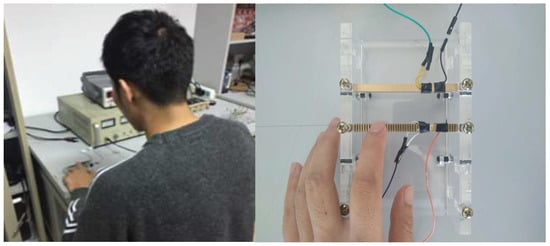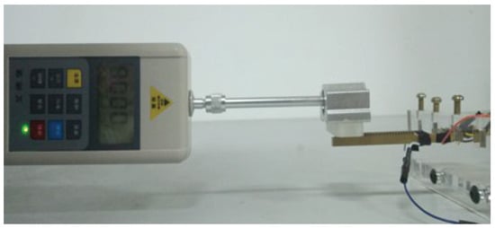A cantilever touch beam with a ciliary body spacing of 1 mm was used as the experimental object. One sine signal with a voltage amplitude of 100 V and a frequency of 23,200 Hz was supplied to the touch beam. An acrylic touch block with a weight of 0.56 N was slowly moved on the touch beam from left to right. The real-time friction force change of the block on the touch beam was measured by a digital dynamometer. The test environment is shown in Figure 15.