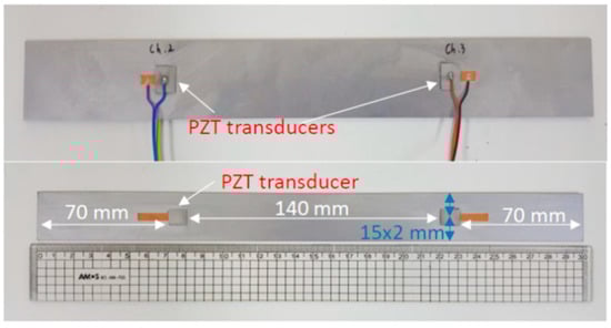 For data acquisition, PZT materials were used to actuate and sense the responses of propagated signals from the medium. The specific PZT material used in this experiment was APC 850 (American Piezo Ceramics), which has high sensitivity characteristics and large displacement effect; these PZT transducers were embedded in the concrete with large damping effects. The material of size 10 mm × 10 mm was attached to 300 mm × 30 mm steel plates such that two PZT specimens were placed on each face of a steel plate separated by 140 mm (a total of four transducers on a single steel plate, PZT specimens were attached on both sides of the plates), as shown in Figure 2. Here, the size of the specimen is smaller than the targeted structure, and further resizing can take place according to the needs and propagation plan. Because the thick transducers generated the ultrasonic waves in the direction of the thickness of the steel plates, thin PZT transducers were used to generate guided waves along the surface of the steel plates. The distance between pairs of the PZT transducers were determined such that signals from the direct path of the PZT transducers could not contaminate the reflected signals from the side and end boundaries of the steel plate.