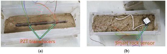 The PZT transducers were embedded in concrete specimens to actuate and produce guided ultrasonic waves and were considered as a sensor to observe the internal dynamic changes of the subjected material [39]. The sensors were embedded in the specimen during the pouring of the concrete and positioned to keep the connections safe for acquiring the data as shown in Figure 3a,b.