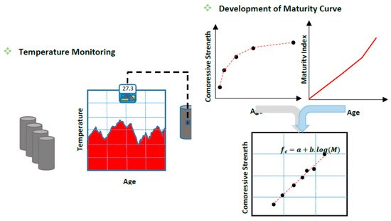 Schematic procedure of temperature history monitoring, maturity index, and compressive strength in the concrete maturity method.