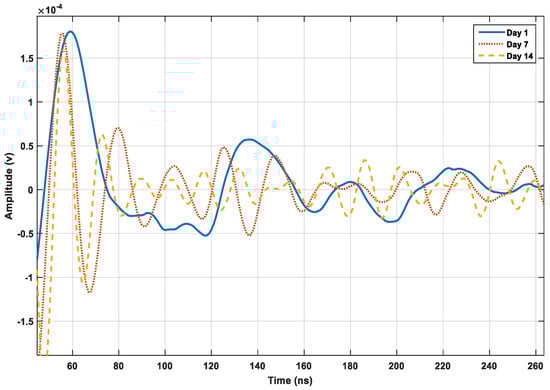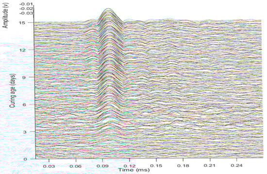 Pattern irrelevancy in the raw signals can be observed for the amplitude change in Figure 6, which shows the data of three different curing ages. Due to phase regulation in the strength gain, there is a clear difference among the data. The arbitrary waveform generator emits ±10 signals peak-to-peak with a frequency ranging from 100 to 300 kHz; the frequency is exerted by the PZT transducers to form the signals. Figure 6 shows the data of the raw signals for different periods. The peaks of the signals with initial generation time have high amplitudes, which decrease with time. The peak inclination differs for different periods and indicates the dynamic variations.