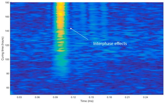 The velocity change in the term of the material stiffness factor occurs prominently in Figure 7; the deepness of the color indicates the rapidity in the velocities and changes of the phases in the material. The wave propagation with curing time changes as the stiffness of the material changes. As the velocities of signals at frequencies near 100 kHz are selected for the A-mode waves, the lower noise data can predict the speed of the waves as a factor for strength monitoring.
