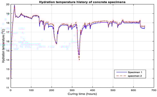The hydration temperature was monitored continuously after pouring the concrete and the smart temperature sensors produced the data for the estimation of the maturity of concrete with curing time. The datum temperature was calculated as −2 °C per ASTM [16,17]. The data of the temperature for the hydration heat is shown in Figure 8.