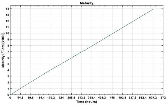 The data of hydration-temperature history was applied to the Nurse–Saul curing function to predict the maturity index. As the datum temperature and time limit were defined, the results showed that hydration temperature was elevated in the initial hours and increased rapidly; that elevation continued to be observed until 28 h after curing, reaching a rise of 20 °C. As time passed, the strength-development improved and the temperature was observed to show lower peaks, as compared with the initial hours, owing to the completion of chemical processes. The experiment was composed of two specimens in the same environmental conditions. Consequently, the temperature data did not show a prominent deviation in curves. The data for the maturity with curing time is shown in Figure 9.
