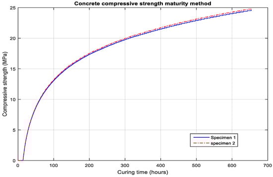 Using the Nurse–Saul function with the datum temperature measured as −2 °C, the maturity index data were calculated as shown in Figure 9, which further simplified the strength of the concrete specimen. The rapid strength development at early ages is prominent from the data results and the compressive strength at the targeted time measured 24.47 MPa, as shown in Figure 10.