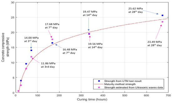 The strength prediction for the described methods produced a simultaneous curing process for the gain of strength, and the results were calculated as 16.48 MPa and 17.68 MPa for the UTM test and ultrasonic wave analysis, respectively.