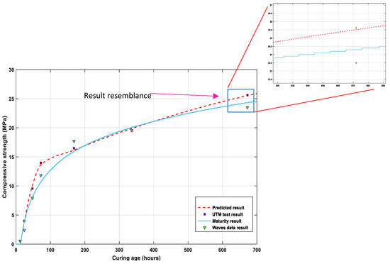 The deviation of the data and specification of the strength-development monitoring is compared by fitting a curve to the analyzed data of the ultrasonic waves propagation data and the maturity method results to make the comparison with compressive strength measured by the penetration resistance test. The fitness of regression for the data model was 0.997, implying a valid fit and permitting a novel modified relation for predicting ultrasonic wave velocities in concrete and the maturity of the concrete at an early age. This is specified in Equation (11),