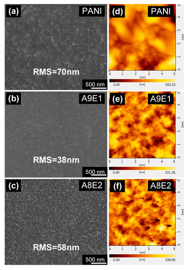 (a–c) SEM images and (d–f) atomic force microscopy (AFM) images and the measured RMS (root-mean-squared) surface roughness for the polyaniline-based conductive copolymer coatings.
