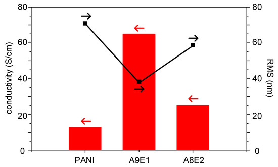 RMS surface roughness (black square) and conductivity (red bar) for polyaniline-based copolymer coatings.