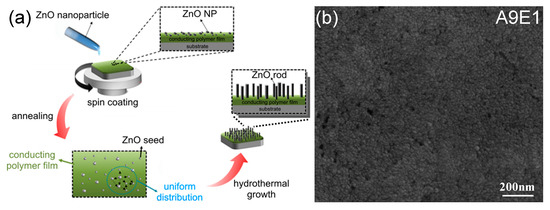 After polyaniline-based copolymers were coated, a seeded hydrothermal method was adopted to fabricate the ZnO nanoparticle seed coating followed by the formation of perpendicularly oriented ZnO nanorod arrays on the seed coating. Figure 3a is the schematic illustration of the seeded hydrothermal fabrication procedure for the formation of the ZnO nanorod arrays. After the deposition of ZnO nanoparticle seed layers on the conducting copolymer coatings, Figure 3b show the SEM images of A9E1 surfaces after the seed layer coating. Compared with A9E1 before the seed layer coating with images shown in Figure 1b, the sample after a seed coating exhibited the presence of ZnO nanoparticles with a uniform particle size of 20 nm coated on the film surface to ensure the subsequent growth of ZnO nanorod arrays.
