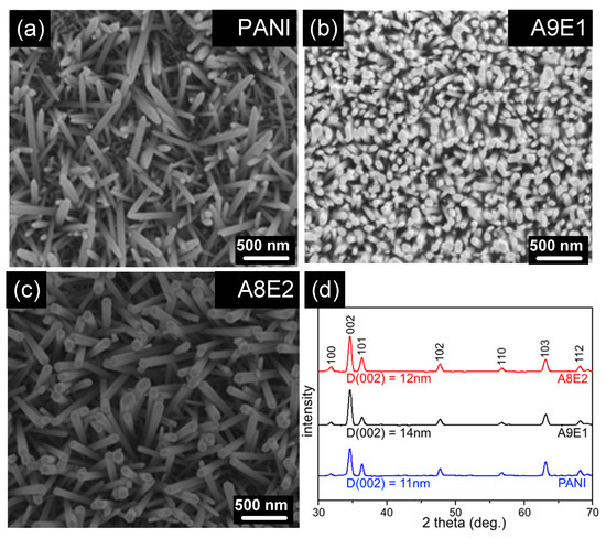 Top-view SEM images of ZnO nanorod array nanogenerator (NG) samples fabricated from (a) PANI, (b) A1E9, and (c) A8E2 coatings. (d) The XRD spectrum for the three ZnO nanorod NG coatings. The grain size D of the (002) diffraction peak for the NG coatings is calculated from measuring the full width at half maximum (FWHM) of the (002) diffraction peak using the Scherrer equation.