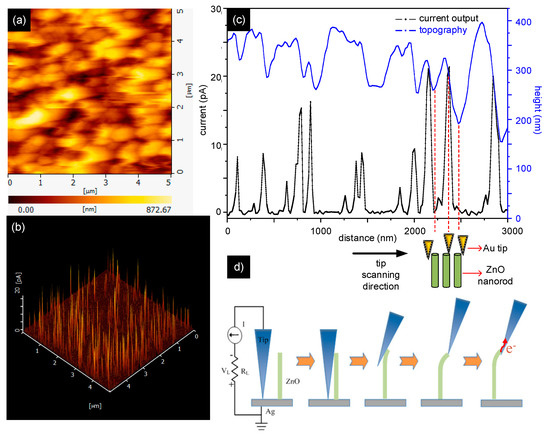 Figure 5a,b shows simultaneous scanning topography plot and current-output profile, respectively, for a line scan of a c-AFM Au coated tip across the ZnO nanorod array of the A9E1 sample. The measurement method was originally developed by Wang and Song in 2006 [4]. For the piezoelectric current measurement c-AFM is operated in contact mode to deflect the aligned ZnO nanorods. As shown in Figure 5b, multiple sharp piezoelectric output current signals with an average peak current at about 10 pA were observed as the tip was scanned across the ZnO nanorods. Therefore, a piezoelectric current could be induced without any external application of bias voltage (self-biased) by rubbing and bending ZnO nanorod NG device. Figure 5c shows the relationship between surface height and output current and shows a high correlation between them, a simultaneous sharp signal could be observed at the position of the ZnO nanorod and induced corresponding piezoelectric current in c-AFM scanning. Specifically, as the AFM stylus began to bend the ZnO nanorod, no piezoelectric current was detected. The induced current was observed as the bending of the nanorod reached its extreme. As the ZnO nanorod was disengaged from the c-AFM stylus, the induced piezoelectric current decreased to zero, demonstrating that the induced piezoelectric current could be observed toward the end of each tip scanning over the ZnO nanorod. A schematic diagram of the piezoelectric current generation process is shown in Figure 5d.