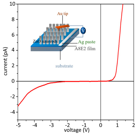 In our current study, a p-type copolymer coating was replaced with a conventionally used n-type ITO coating as the conductive substrate in the devices. It is important to show that the overall device still exhibited a Schottky barrier, which is critical to provide the necessary piezoelectric property upon the application of external forces on the ZnO nanorod arrays. Figure 6 shows the I–V characteristics of an A8E2 sample measured by using c-AFM with an Au coating tip. The device exhibited a characteristic rectifying junction in which the current rose exponentially under a forward bias and decreased to nearly zero under a reverse bias. Therefore, the device with a p-type copolymer coating exhibited the necessary piezoelectric property as a Schottky junction. Therefore, a piezoelectric current could be induced without any external application of bias voltage (self-biased) by rubbing and bending the ZnO nanorod NG device.