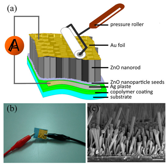 To demonstrate the feasibility for future application, large area (2 cm by 2 cm) piezoelectric nanogenerator devices based on the current ZnO nanorod array/copolymer coatings were fabricated. The piezoelectric nanogenerator was further assembled by covering an Au foil as one electrode on the surface of ZnO nanorod arrays and applying silver paste on the copolymer coating as the other. The contact electrodes (Au and Ag) at both ends of the semiconducting ZnO nanorod layers were Schottky contacts in accordance with the general requirements for their piezoelectric property measurements. The piezoelectric current was measured using an ammeter (CH Instruments CHI 4052A Electrochemical Analyzer, CH Instruments Inc., Austin, TX, USA) when an external force was applied by rubbing the Au foil layer on the NG device with a pressure roller.