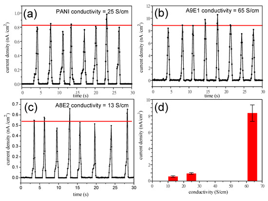 As shown in Figure 8, the piezoelectric current generated by the rolling motion of the Au film coating was plotted as a function of time during which large area polyaniline-based piezoelectric nanogenerator devices were rubbed against a pressure roller. Note that the peak piezoelectric current generated from these large area devices was in the range of nA, which was at least 100 folds larger than those measured in the previous conducting AFM measurement in which the peak piezoelectric current thus produced was in the range of pA due to only single ZnO nanorod bending with a force exerted from the AFM Au scanning tip. The average peak piezoelectric current generated from PANI and A8E2 devices with lower conductivity and less uniform ZnO nanorod array was around 0.5 nA/cm2 (Figure 8a) and 0.8 nA/cm2 (Figure 8c), while that for A9E1 device was markedly larger at a value of 8.0 nA/cm2 (Figure 8). As shown in Figure 8d, the peak piezoelectric current was directly proportional to the increase in the conductivity of the underlying charge collection conductive copolymer coatings. Therefore, the combined results shown above demonstrated that an improved conductivity and uniform coating surface produced from the controlled copolymerization reaction for the subsequent formation of dense ZnO nanorod arrays with improved crystallinity were critically important in enhancing the overall piezoelectric performance of the nanogenerator devices thus produce [67,68].