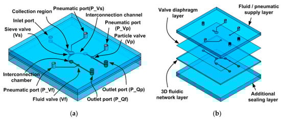 The pneumatically driven microfluidic platform that concentrates particles. (a) A schematic of the concentrator. (b) Device assembly. (P: port, Q: flowrate, f: fluid, p: particle, V: valve, s: sieve).