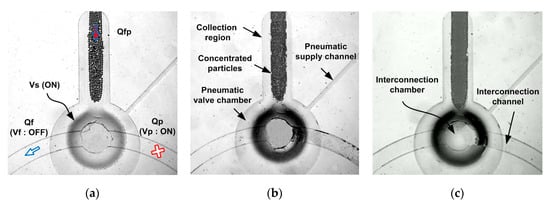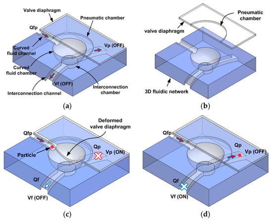 Figure 2a shows the structure of Vs that blocks particles suspended in the introduced fluid (Qfp). The Vs mainly consists of the valve diaphragm and 3D microfluidic network, as shown in Figure 2b. The curved fluidic channel used for sample introduction (at the front of the 3D fluidic network) is connected at the bottom, via the curved fluid chamber, to the chamber of the rectangular cross section at the back. The fluid flows of particles and pure fluid to the outlet ports, via the interconnection channels, are controlled by the Vp and Vf, respectively. Figure 2c shows the operational method to trap particles. When pressure is applied to the Vs and the Vp, the diaphragms deform and particles in fluid (Qfp) are blocked at the interfacial region between the curved fluid channel and the curved fluid chamber; fluid flow through the interconnection channel (Qp) then ceases. However, unwanted fluid (Qf) is discharged through the open Vf. Figure 2d shows release of the blocked particles. When pressure is applied to the Vf only, the blocked particles (Qp) are discharged through the interconnection channel. Particles of various sizes can be blocked and concentrated by controlling the pressure applied to the Vs.