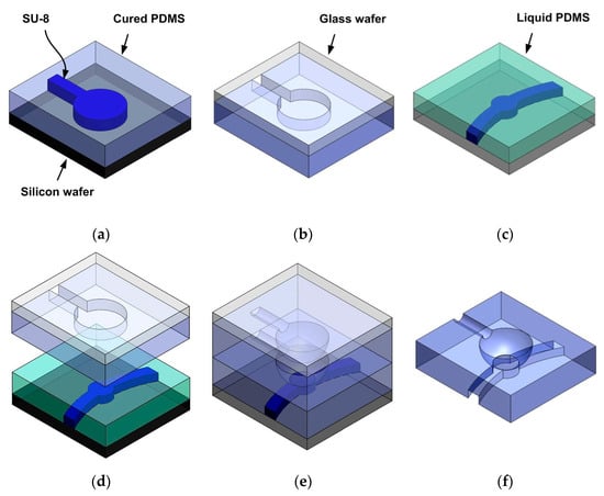 Fabrication of the three-dimensional (3D) fluidic network. (a) Replica molding of the curved microfluidic chamber and channel, (b) plasma bonding of the cured polydimethylsiloxane (PDMS) layer to a glass wafer, (c) pouring of liquid PDMS into an SU-8 mold to form the interconnection channel, (d) alignment of the bonded structure and an SU-8 mold, (e) replication via thermal curing at 130 °C for 30 min, (f) removal of the thermally activated structure and the SU-8 mold.