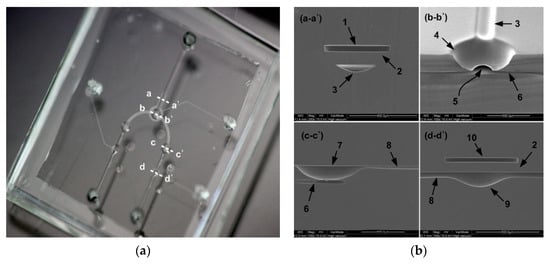 The pneumatically driven microfluidic platform that concentrates particles. (a) Fabricated device, (b) scanning electron micrographs (SEMs) of device cross sections (a-a’: the particle collection region, b-b’: Vs, c-c’: the interconnection chamber, d-d’: the Vp valve, 1: pneumatic chamber for particle collection, 2: the valve diaphragm, 3: the curved particle collection channel, 4: the curved fluid Vs chamber, 5: the interconnection port, 6: the interconnection channel, 7: the interconnection chamber, 8: the curved fluid channel to the outlet port, 9: the fluid chamber for Vp (Vf), 10: the pneumatic chamber for Vp (Vf)).