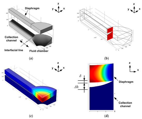Finite element method (FEM) simulation results. (a) The FEM model, (b) the cut-plane at the interface of the collection channel and fluid chamber of the Vs, (c) structural deformation of the valve diaphragm when a pressure of 10 kPa was applied, (d) diaphragm deformation at the cut-plane.