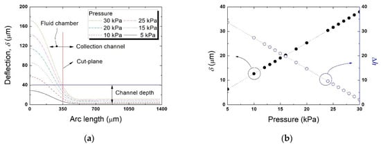 Simulation of polydimethylsiloxane (PDMS) valve diaphragm deflection (in the y–z plane) by applied pressure. (a) Deflection of the valve diaphragm within the particle collection region and the fluid chamber of the Vs, (b) maximum diaphragm deflection (δ) at the cut-plane (x–z plane) and the height difference (Δh) between this deflection and the central depth of the collection channel (40 μm).