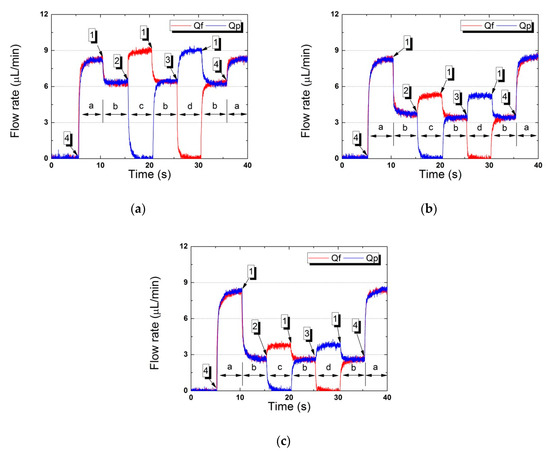 The working fluid flow rate over time as particles became concentrated by the microfluidic platform (a–d show that the positions of the pneumatic valves changed). (a) Vs at 15 kPa, (b) 26 kPa, (c) 30 kPa.