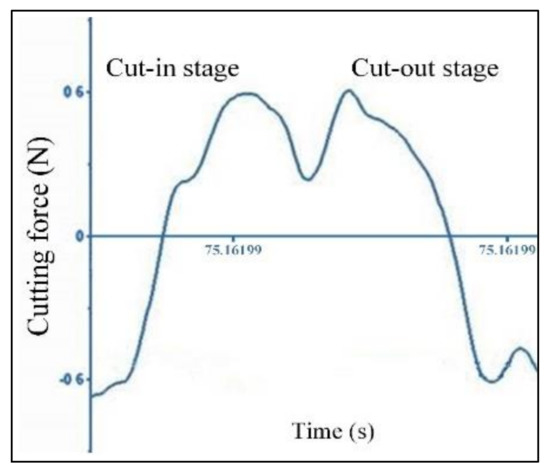 The enlarged diagram of the cutting force signal of single cutting pass at fz = 0.22 μm is shown in Figure 8. It is seen that the cutting force signal curve of single cutting pass exhibits a crater shape. The theoretical sine profile is not observed in the cutting force signal. With tool rotating, the peak point does not appear at the middle position but appears at the cut-in and cut-out stage. This result also verifies the (n+2)th cutting pass, as shown in Figure 5d. The residual material from previous cutting pass leads to the instantaneous undeformed chip thickness in the cut-in and cut-out stage exceeding the minimum undeformed chip thickness, and then the cutting behavior occurs. This corresponds at the peak points in the cut-in and cut-out stage. But, at the middle position, there is no residual material, and the low instantaneous undeformed chip thickness cannot form cutting behavior. It corresponds to the crater on the cutting force signal waveform.