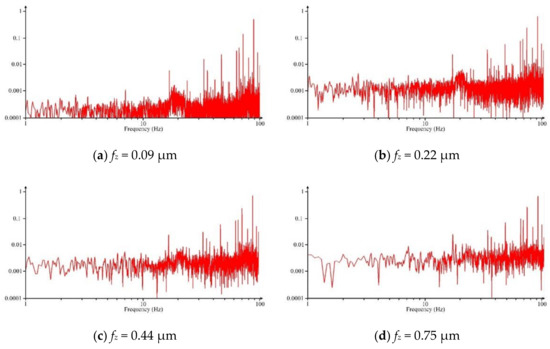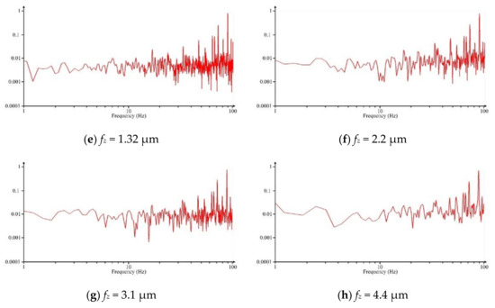 Due to the influence of the minimum undeformed chip thickness phenomenon in cutting process, besides the frequencies of spindle rotating, there are other additional frequencies, such as the unstable cutting behavior, the periodic material accumulating, ploughing effect, etc. These additional frequencies, mainly caused by the minimum undeformed chip thickness, usually are smaller than the frequency of spindle rotating. Hence, to observe these additional frequencies, Fourier transform is performed on the recorded cutting force and the frequency domain signal in the range of 100 Hz is shown in Figure 9. It is observed that the characteristic frequency gradually decreases with increasing the feed per tooth. When the feed per tooth is less than the minimum undeformed chip thickness, the characteristic frequency that distributed on frequency domain signal is very extensive and complex, and the cutting process is very unstable, as shown in Figure 9a–c. Once the feed per tooth increases to larger than hmin, the characteristic frequency distribution exhibits a great reduction because the additional frequencies gradually eliminates, as shown in Figure 9e–g. Once the feed per tooth reaches tool cutting edge radius, the characteristic frequency distribution becomes relatively few, as shown in Figure 9h. It indicates that the cutting process becomes very stable.