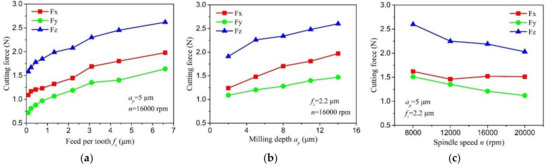 Figure 10 shows the cutting force curve at different milling parameters. Among the components of resultant force, the passive force Fz is the largest, the feed perpendicular force Fx is the middle, and the feed force Fy is the smallest. It is seen that the cutting force exhibits a gradually increase trend with the feed per tooth due to more material is removed during micro milling process. When the feed per tooth increases from 0.09 μm to 6.6 μm, the feed perpendicular force, feed force, and passive force increase from 0.72 N, 1.09 N, and 1.58 N to 1.64 N, 1.99 N, and 2.61 N, respectively. The cutting force shows an approximately linear increase trend with depth of the cut. Once the depth of cut increases from 2 μm to 14 μm, the three components of resultant force increase from 1.09 N, 1.24 N, and 1.91 N to 1.47 N, 1.97 N, and 2.63 N, respectively. With the increase of spindle speed, the cutting force presents a gradually decrease trend, and the decrement of the passive force is relatively larger among the three components of resultant force.