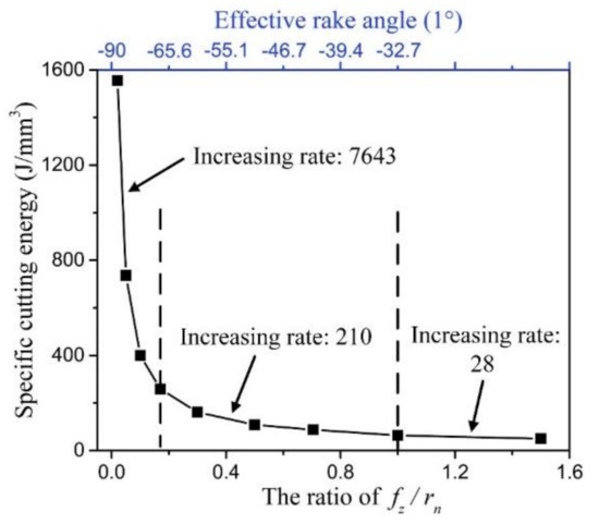 Figure 11 shows the specific cutting energy varying with the ratio of fz/rn. The corresponding effective rake angle is marked out on the figure. It is seen that the specific cutting energy curve nonlinearly increases with the decrease of the ratio of fz/rn and exhibits obvious size effect. The increasing rate can be reflected in the averaging slope of specific cutting energy curve. Based on the increasing rate, the specific cutting energy curve can be divided into three zones. When the ratio of fz/rn is larger than 1, the increasing rate of specific cutting energy curve is 28, and this is the zone of weak size effect. In this zone, the cutting process is stable with the state of positive tool rake angle. And the specific cutting energy is low due to the cutting behavior is dominant during cutting process. Once the ratio of fz/rn is less than 1 and larger than 0.17, the increasing rate of specific cutting energy curve is 210, and this is the zone of medium size effect. The cutting process begins to go into the state of negative effective rake angle. The energy consumption gradually increases due to more serious ploughing in cutting process. Once the ratio of fz/rn is less than 0.17, the increasing rate rapidly reaches to 7643, and this is named the zone of severe size effect. In this case, the effective rake angle decreases to more negative than the minimum negative rake angle for chip formation, and the whole cutting process goes into the minimum undeformed chip thickness phenomenon. The ploughing factor becomes dominant in cutting process, and it consumes extensive energy. Hence, the specific cutting energy is very large.