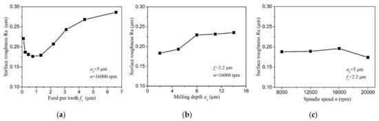 Figure 12 shows the effect of milling parameters on surface roughness. It is found that the feed per tooth presents the greatest effect on surface roughness Ra. The surface roughness first decreases, and then gradually increases with the decrease of the feed per tooth. The minimum surface roughness is obtained to be 0.176 μm at fz = hmin. Once the feed per tooth is less than hmin, the cutting state of severe negative rake angle and the dominant ploughing in cutting process greatly deteriorate the machined surface, resulting in the larger surface roughness. When the feed per tooth is larger than hmin, the theoretical residual material, which increases with the feed per tooth, is the key factor that affects surface roughness. Hence, the surface roughness increases with the larger feed per tooth, as well. The surface roughness exhibits a gradual increase trend with the increase of depth of cut. The larger depth of cut can lead to the higher cutting force and then may induce more tool deflection due to the small diameter and weak rigidity of micro end mill. To a certain extent, this factor can slightly increase the surface roughness. With the larger cutting speed, the surface roughness shows a slight decrease. But the effect of spindle speed on surface roughness is relatively little.