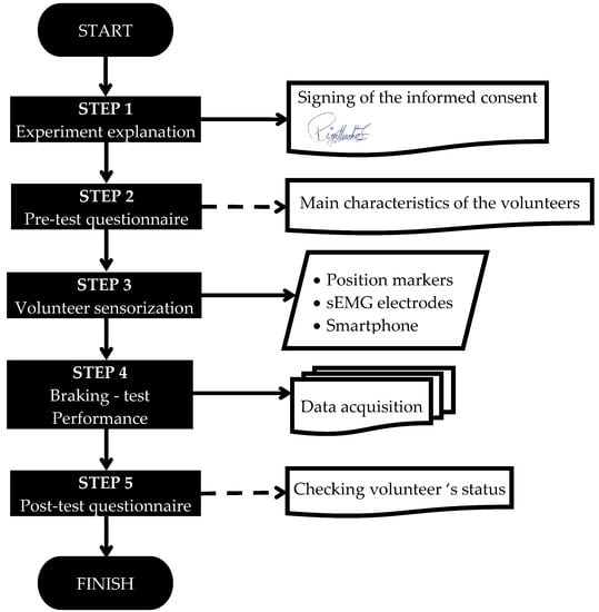Step 1 (Experiment explanation): This stage is focused on the information. In this step, every volunteer was advised about the risk of participating in the experiment, where several emergency braking scenarios would be performed. In case they agreed to take part in this study, each volunteer had to sign a consent form. In any case, the subjects always had the chance, at any time during the whole experiment, to leave the test if they wanted to.