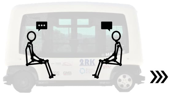 - Emergency braking test 1 (BT1) (Figure 2): While the vehicle drives and the subject stays sitting in the direction of travel (meaning forward), without a seat belt and talking to one person in front of him, the autonomous bus suddenly brakes. The reasons why during this test, the volunteer is talking to a member of the research team seated in front of him, is because we wanted the muscles of the volunteer to be relaxed, since muscular tension influences the cervical response. In this way, we ensure that the participant is distracted and stress-free, as well as with the head looking ahead and not inclined. In addition, the volunteer ignored the emergency braking instant of time.
