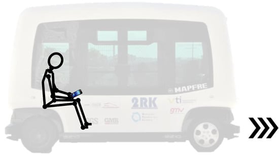 Figure 2. Emergency braking test 1 (BT1) schema. - Emergency braking test 2 (BT2) (Figure 3): While the vehicle drives and the subject stays watching the smartphone (meaning head tilted forward) sitting in the direction of travel (forward), without a seat belt and watching the smartphone between his legs, the autonomous bus suddenly brakes. In this test, it is also required that the muscles of the volunteer are relaxed. Therefore, the braking instant of time is also not known by the subject.