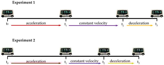 For a better understanding of the experiment’s timing, the following figure was designed (Figure 4). As can be seen, each experiment is split into three zones, the “acceleration period” (red arrow from t0 to t1), the “constant velocity period” (purple arrow from t1 to t2) and the “deceleration time” (yellow arrow from t2 to t3). Moreover, Figure 4 shows the timing for two different tests (Experiment 1 and Experiment 2), where the first one lasts longer than the second one. That gap is due to the difference of the “constant velocity period”, because it is longer in Experiment 1 than in Experiment 2 (braking happens earlier in Experiment 2 than in Experiment 1). In contrast, the “acceleration period” and “deceleration period” were always the same, around 5 s and 2 s, respectively. The moment when the autonomous bus starts braking (t2) was randomly selected once the bus reaches enough velocity to get a 4 m/s2 deceleration to catch the volunteers off guard.