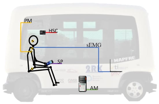 Step 3 (Volunteer sensorisation): In this stage, sEMG sensors were placed on the trapezius (TRP) and on the sternocleidomastoid (SCM) muscle, through a palpation test [], where the mid-belly and the upper part of the muscle were located following the SENIAM (Surface ElectroMyoGraphy for the Non-Invasive Assessment of Muscles) recommendations (use of bipolar configuration with the positive electrode close to the middle of the muscle and the negative close to the distal beginning). It is important to highlight that, before sticking the sensors, the area was properly shaved with a disposable razor blade, and after, carefully cleaned with alcohol and a sterile muslin. These neck muscles and their electrode placement were chosen considering several previous biomechanical studies with a similar goal to this work [,,]. Moreover, the movement of the volunteers was registered by means of reflective markers placed on the head, spine, torso, shoulder, pelvis and lower limbs, as well as a high-speed camera installed in the bus to record the passenger motion in the sagittal plane. Despite that the kinematic analysis of the movement is not part of the scope of this work, data collected by the camera was utilised to contrast the information collected by the sEMG sensors. Additionally, a smartphone was given to each of the volunteers to keep in their hands while performing one of the autonomous driving tests. Volunteers were instructed to hold the smartphone in the same manner, resting the arms on the thighs. Before starting the braking test, the research team verified that the position was adequate. In this way, the manner of holding this device was similar between different participants. Notwithstanding, authors want to point out that the real aim of using a smartphone is to assess what happens in an emergency braking when the head is initially tilted forward.