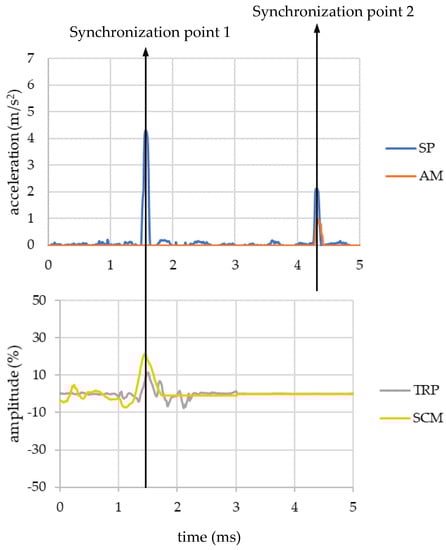 The process has been summarised in the following figure (Figure 6), where the beginning of the four signals (SP, AM, TRP and SCM) are plotted. On the top, the signals of the SP and AM are represented and the sEMG signal from both muscles is shown on the bottom. As it was said above, the first movement originates a peak in the SP and in the muscles (Synchronization point 1) that makes it possible to synchronise both signals. After that, the second movement is performed, and it produces a common peak in the SP signal and in the AM signal. In this way, all signals were synchronised. It is important to mention that this entire process was carried out with the bus stopped.