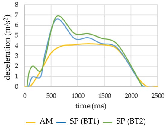 Figure 7 represents the average of the acceleration registered in all the experiments. In Figure 7, it can be noticed that the SP signal was split into two different ones. The first one corresponds to the mean of the values obtained in BT1 and the second one to the mean of the results obtained in BT2. In this graph, it can also be appreciated that the acceleration that each volunteer experienced inside the autonomous bus is greater than the acceleration that the vehicle underwent when the emergency braking was activated.